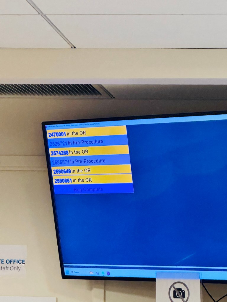 Then the nurse brought me back into the pre-op. Niel waited and they were extremely caring with him as well. They explained that they would get me ready and then he could come back and sit with me until operation. They also gave him a card with my patient ID on it so he could follow on the screen in the waiting room.