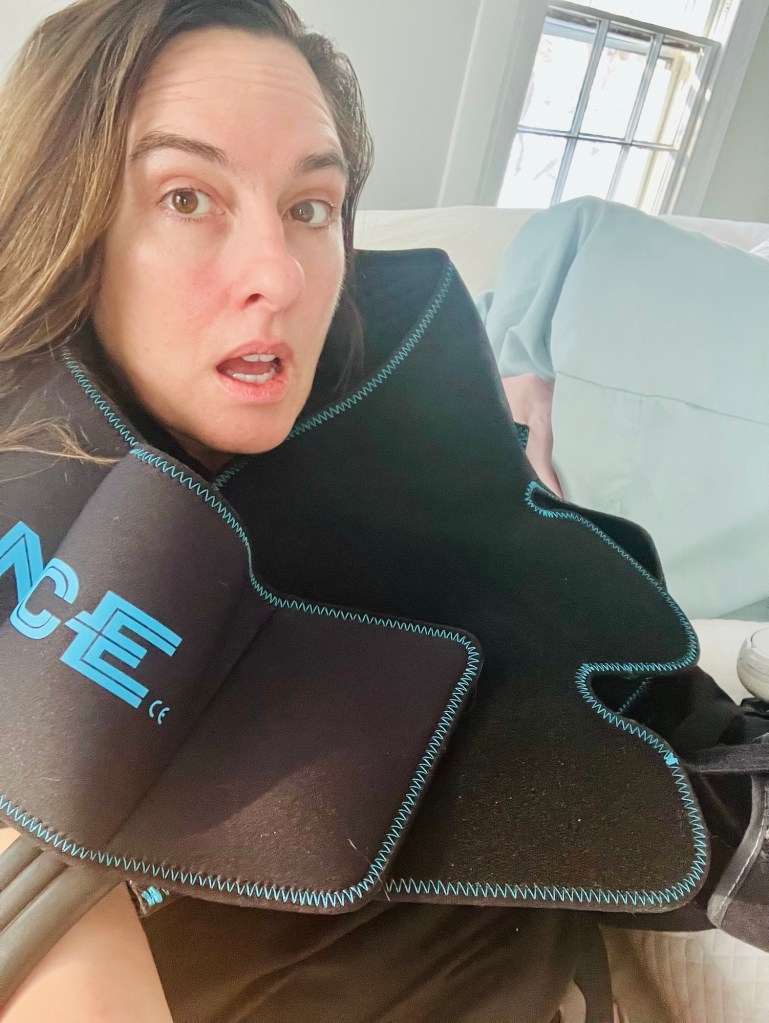 Another doctor came in to go over my pain management after surgery, reviewed the medications they had already called in to CVS that we actually had already picked up. They explained the nerve block. Then the anesthesiologist came in. He was incredible. He said they were gonna give me just the general anesthesia, not totally knocked out and intubated or whatever, with the mask and all. So it was just through the IV, and they put the nerve block in when I was under, so I didn’t feel anything. The nerve block is just wearing off and this is the next morning. He was just so thorough and so kind and said he would be with me the entire time.