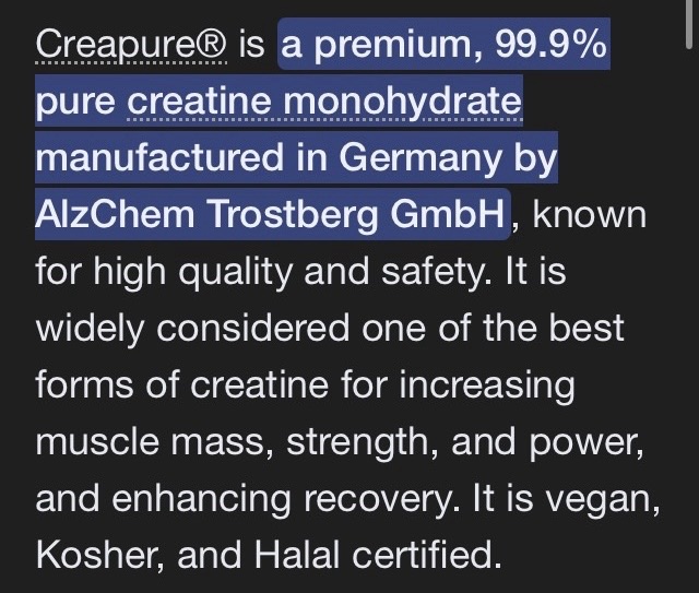 ≥99.9% pure creatine monohydrate Pharmaceutical-grade manufacturing Tested for heavy metals, contaminants, and byproducts (like creatinine) No fillers, dyes, or additives Very gentle on the stomach